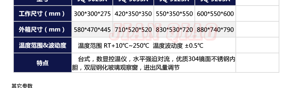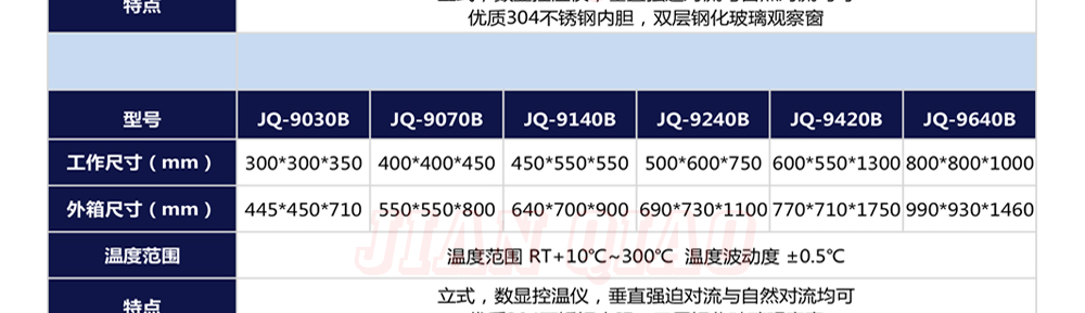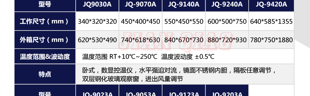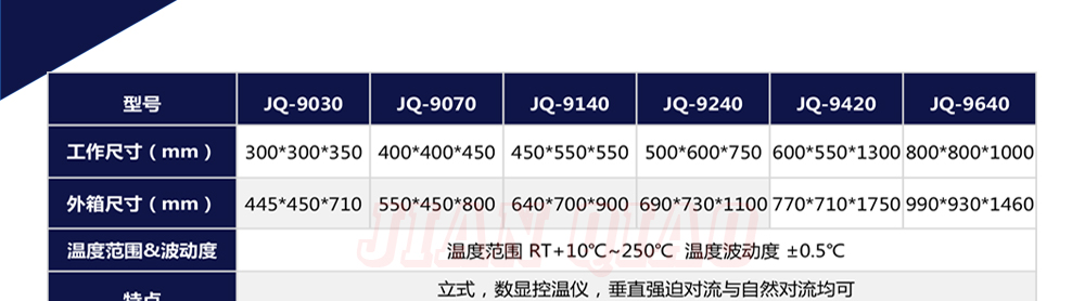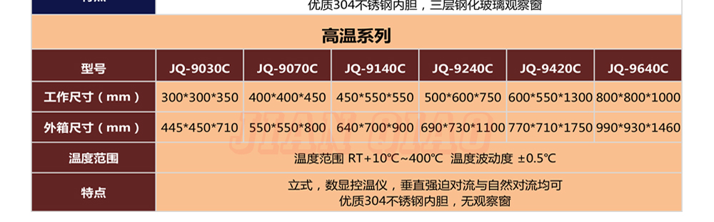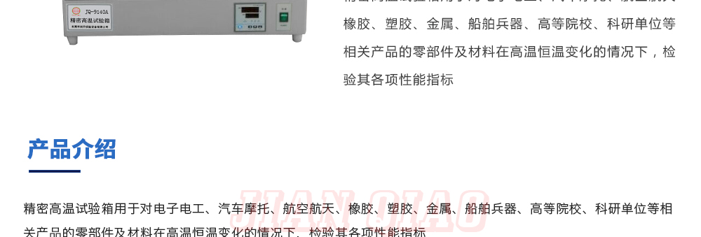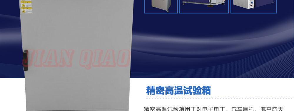 产品型号:JQ-9030 品牌:剑 乔 用途:精密高温试验箱用于对电子电工、汽车摩托、航空航天、橡胶、塑胶、金属、船舶兵器、高等院校、科研单位等相关产品的零部件及材料在高温恒温变化的情况下,检验其各项性能指标咨询热线:13829135130