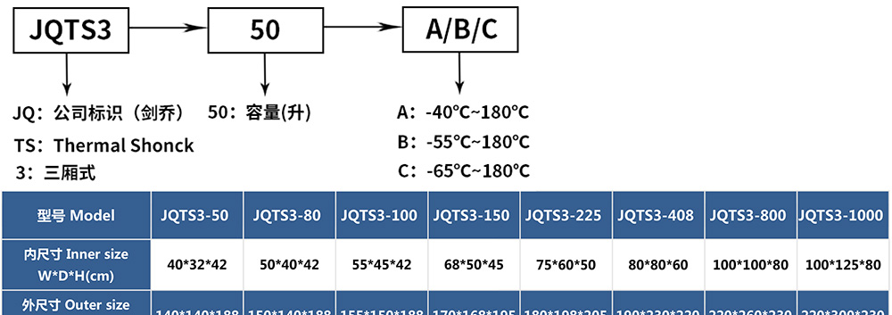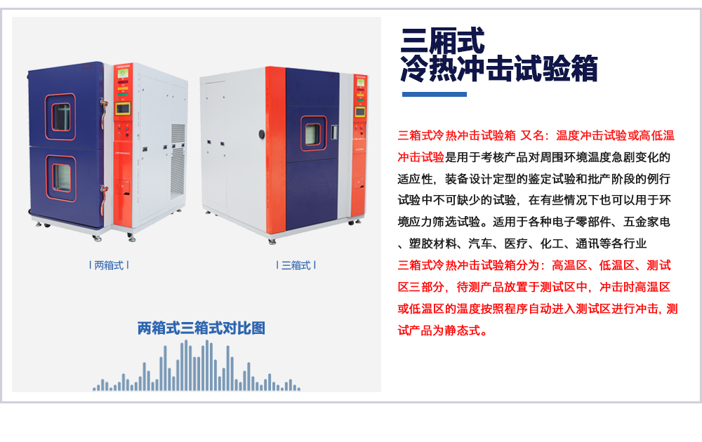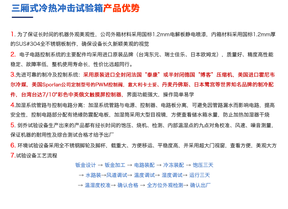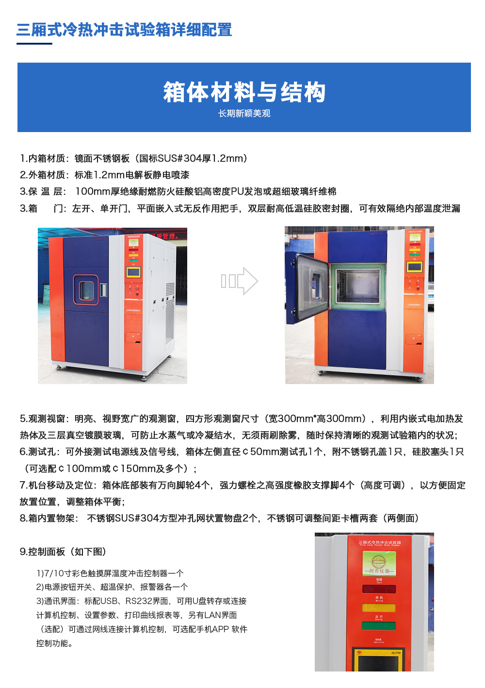 产品型号:JQTS3-408 品牌:剑 乔 用途:三箱式冷热冲击试验箱又名温度冲击试验或高低温冲击试验是用于考核产品对周围环境温度急剧变化的适应性,装备设计定型的鉴定试验和批产阶段的例行试验中不可缺少的试验,在有咨询热线:13829135130