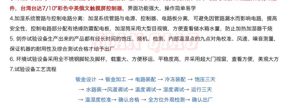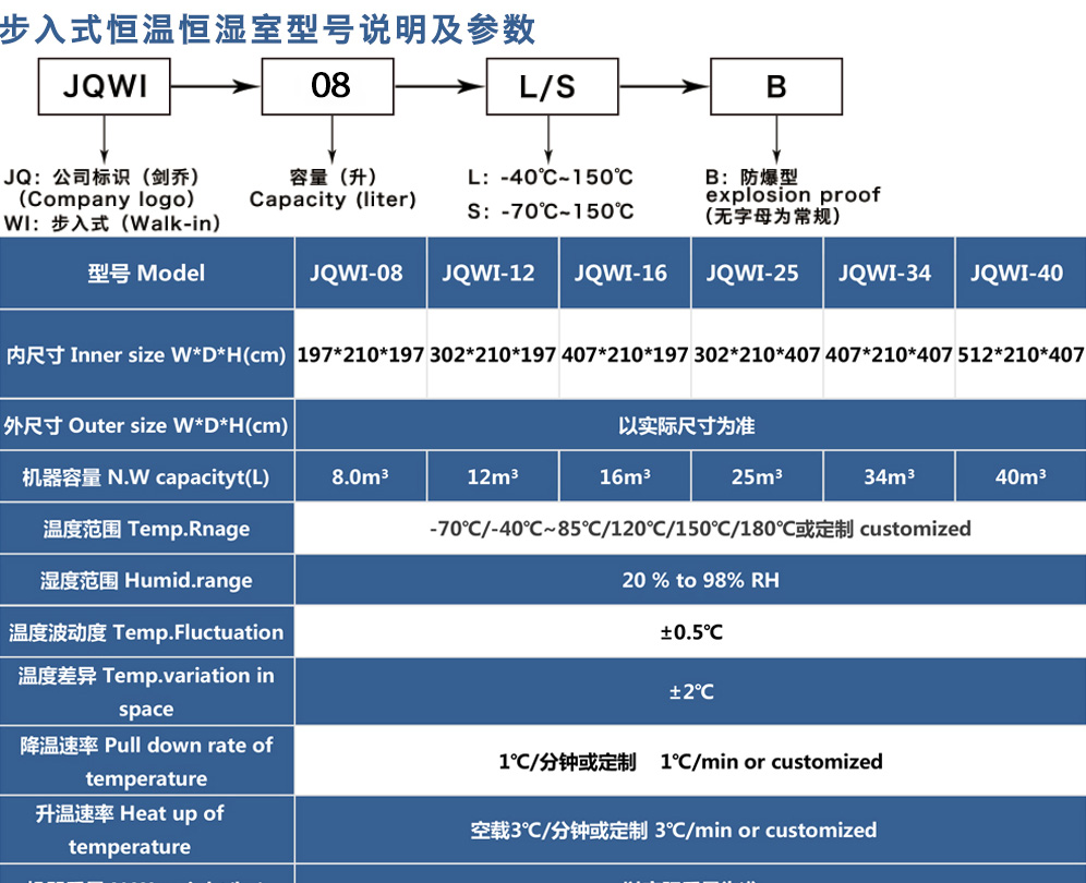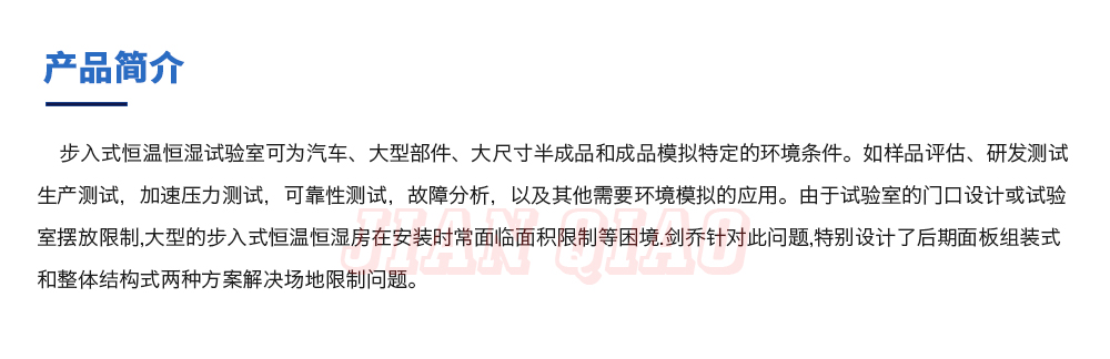 产品型号:JQWI-12(非标定制款) 品牌:剑 乔 用途:步入式恒温恒湿试验室可为汽车、大型部件、大尺寸半成品和成品模拟特定的环境条件。如样品评估、研发测试生产测试,加速压力测试,可靠性测试,故障分析,以及其他需要环境模咨询热线:13829135130