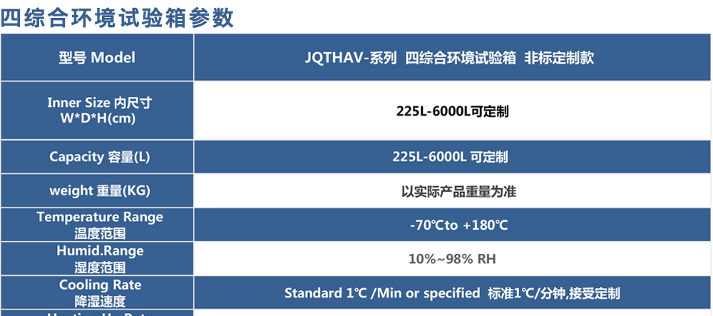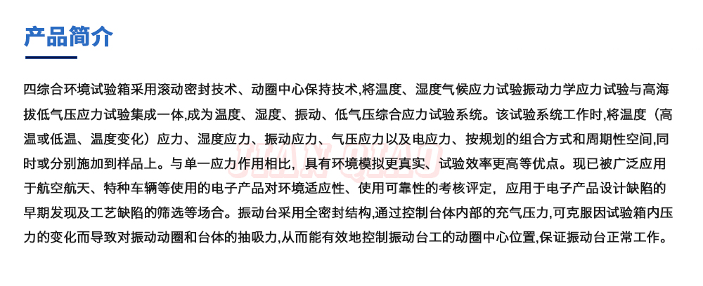 产品型号:JQTHAV-非标定制型 品牌:剑 乔 用途:四综合环境试验箱采用滚动密封技术、动圈中心保持技术,将温度、湿度气候应力试验振动力学应力试验与高海拔低气压应力试验集成一体,成为温度、湿度、振动、低气压综合应力试验系咨询热线:13829135130