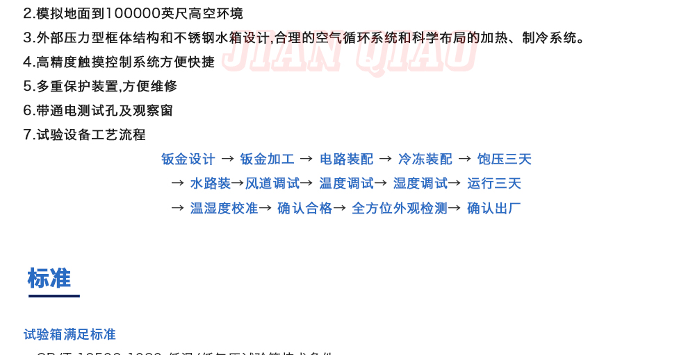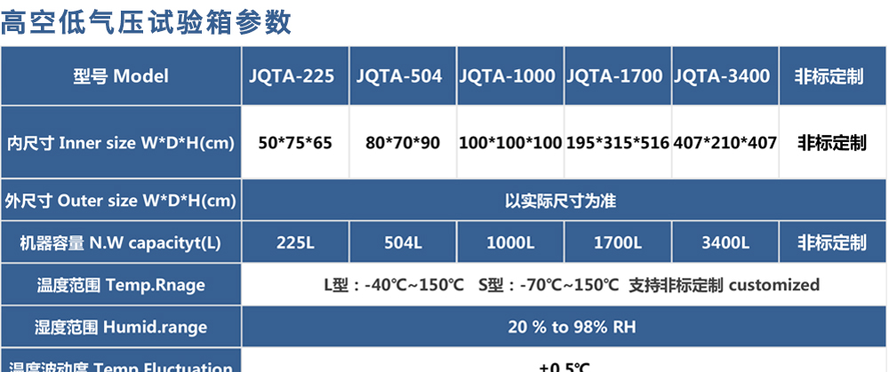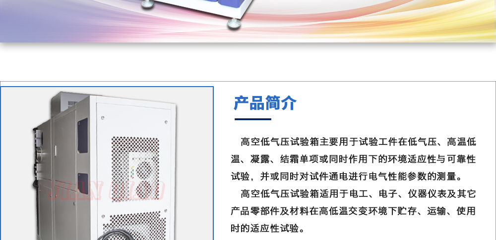 产品型号:JQTA-225 品牌:剑 乔 用途:高空低气压试验箱主要用于试验工件在低气压、高温低温、凝露、结霜单项或同时作用下的环境适应性与可靠性试验,并或同时对试件通电进行电气性能参数的测量。高空低气压试验箱咨询热线:13829135130
