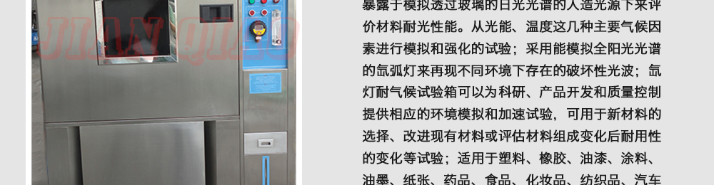 产品型号:JQ-3F-100 品牌:剑 乔 用途:氙灯老化试验箱,氙灯耐候试验箱,氙灯光老化试验机是一种综合气候试验装置,除进行气候老化试验外还可进行高分材料的耐光性的测试,即高分子材料暴露于模拟透过玻璃的日光光谱的咨询热线:13829135130