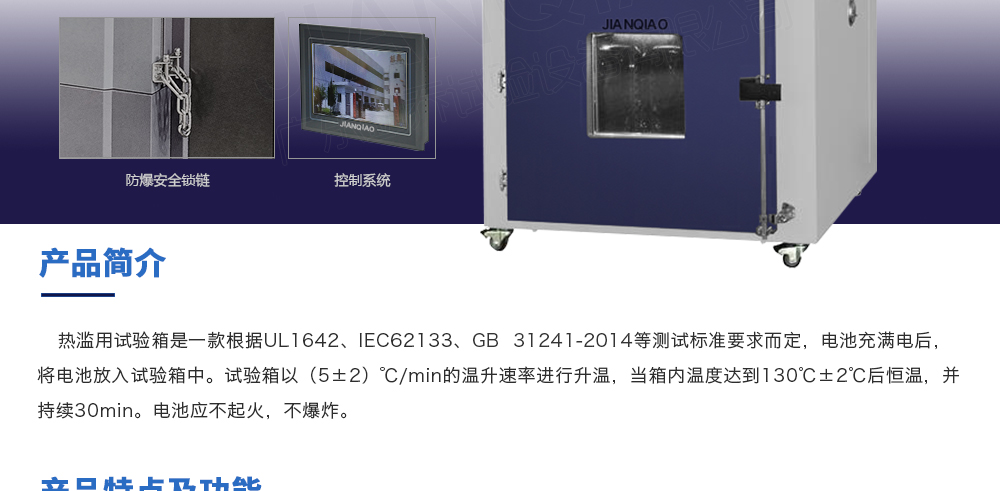 产品型号:JQ-101-512A 品牌:剑 乔 用途:热滥用试验箱是一款根据UL1642、IEC62133等测试标准要求而定,电池充满电后,将电池放入试验箱中。试验箱以(5±2)℃/min的温升速率进行升温,当箱内温度达到130℃±2℃后恒温,并持续咨询热线:13829135130