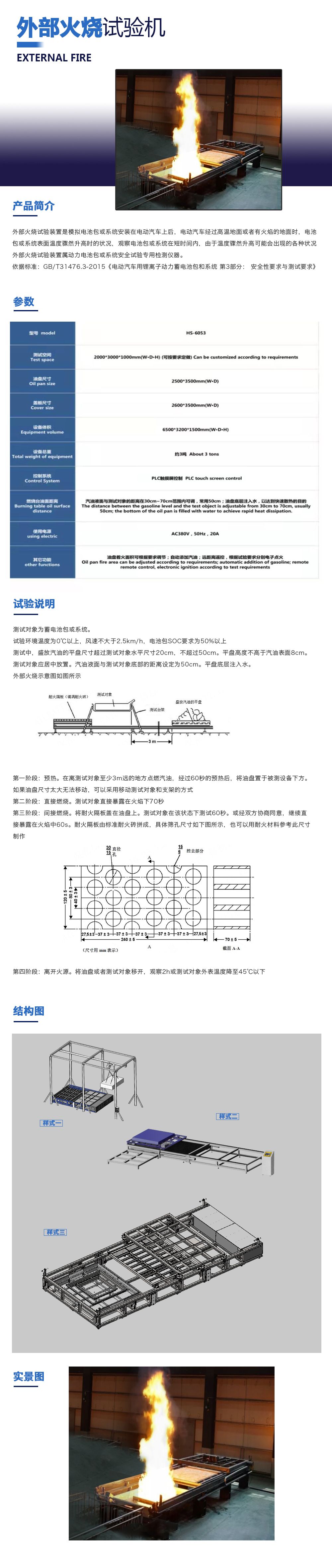 产品型号:JQ-8202-2500 品牌:剑 乔 用途:外部火烧试验装置是模拟电池包或系统安装在电动汽车上后,电动汽车经过高温地面或者有火焰的地面时,电池包或系统表面温度骤然升高时的状况,观察电池包或系统在短时间内,由咨询热线:13829135130