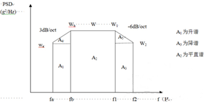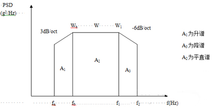 为了简便起见,往往将功率谱密度曲线图划分成若干矩形和三角形,并利用上升斜率(如3dB/oct)和下降斜率(如-6dB/oct)分别算出wa 和w2,然后求各个几何形状的面积与面积和,再开方求出加速度总均方根值。