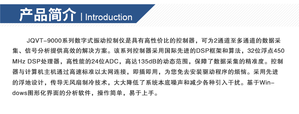 产品型号:JQVT-9000系列 品牌:剑 乔 用途:JQVT-9000系列数字式振动控制仪具有高性价比的控制器,可为2通道至多通道的数据采集、信号分析提供高效的解决方案。该系列控制器采用国际先进的DSP框架和算法,32位浮点450 MHz DSP处理器,咨询热线:13829135130