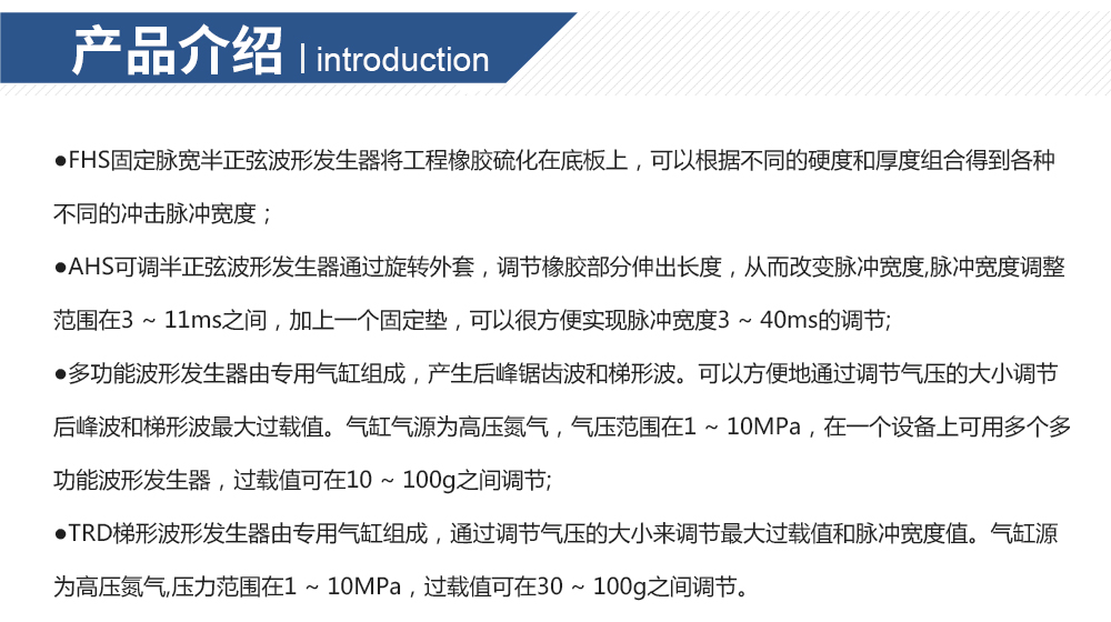 产品型号: 品牌:剑 乔 用途:FHS固定脉宽半正弦波形发生器将工程橡胶硫化在底板上,可以根据不同的硬度和厚度组合得到各种不同的冲击脉冲宽度。咨询热线:13829135130