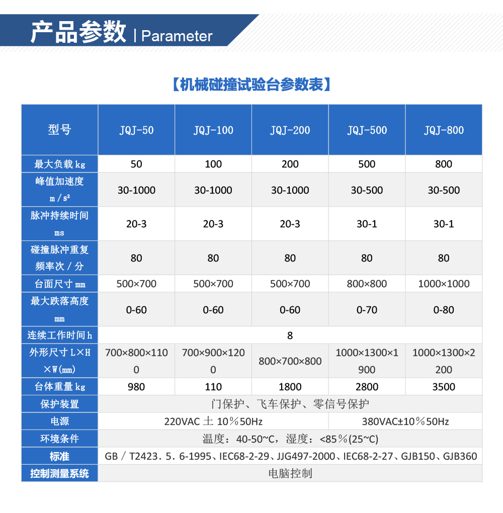 产品型号:JQJ-100 品牌:剑 乔 用途:机械碰撞试验台模拟仿真装备及组件在使用与运输过程中,可能遭遇的冲击效应为主,并透过冲击波于瞬间瞬时能量交换,分析产品承受外界冲击环境之能力,试验之目的在于了解其机咨询热线:13829135130