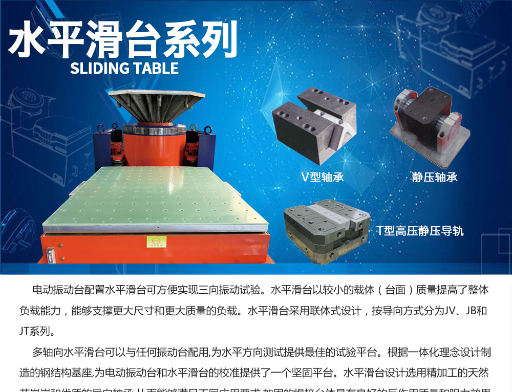 产品型号:JV-03KN 品牌:剑 乔 用途:振动台配置水平滑台可以实现三向振动试验,也可以配合温湿试验箱形成复合环境试验系统。多轴向水平滑台可以与任何振动台配用,为水平方向测试提供最佳的试验平台。根据一体化理咨询热线:13829135130